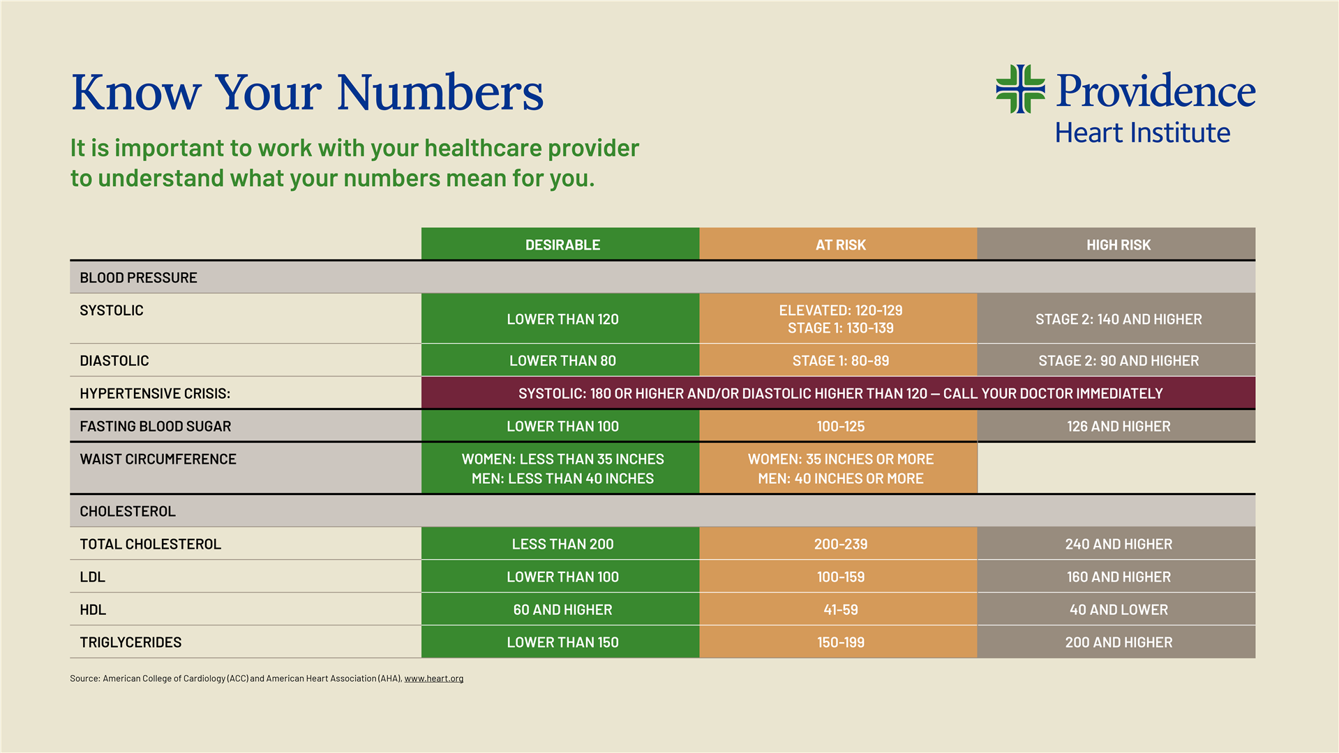 Review the image below to understand the current guidelines for your blood pressure, glucose, and cholesterol.